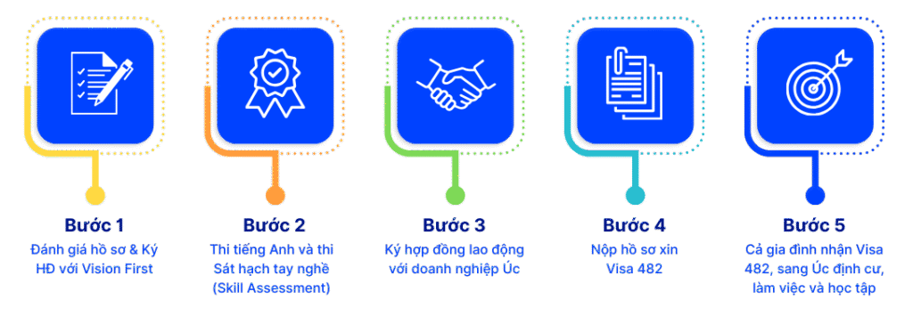 - Cả gia đình nhận Visa 482, sang Úc định cư, làm việc và học tập: Khi Visa 482 của bạn được duyệt, bạn và gia đình sẽ có thể sang Úc định cư, làm việc và học tập. Vision First sẽ hỗ trợ bạn trong quá trình chuẩn bị và chuyển đến Úc.